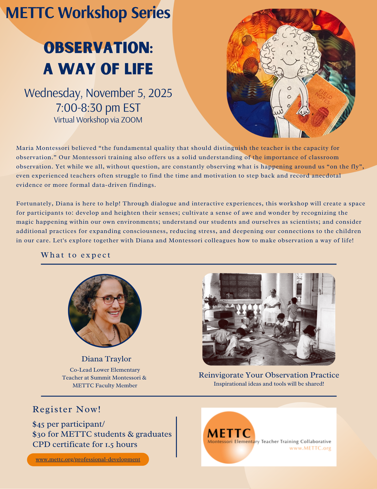 Cost: $125. Pre-registration is required (details will be emailed upon receipt of paid registration). To register, email joel@mettc.org and include your summer phone number and contact information along with your email. Online payment option through METTC’s PayPal link: http://paypal.me/MontessoriMETTC