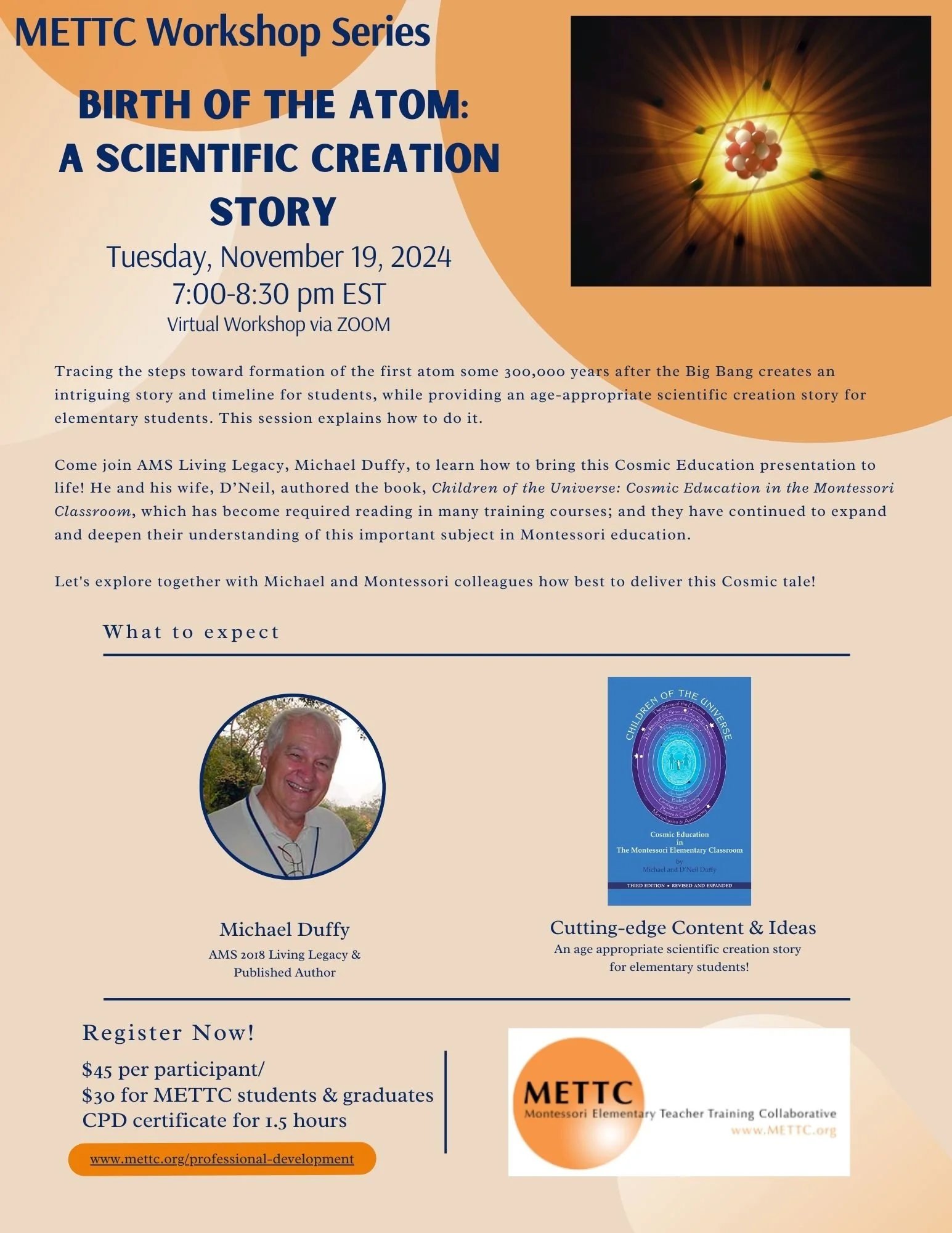 Register above to receive a recording of Michael Duffy’s ZOOM workshop on bringing our Cosmic Education presentations into the 21st century!